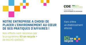 Cette attestation reconnaît les pratiques en place en gestion des matières résiduelles ainsi que les engagements pris pour l’année à venir. Elle témoigne des efforts continus pour adopter des pratiques écoresponsables, réduire notre empreinte environnementale et contribuer à la protection de l’environnement.