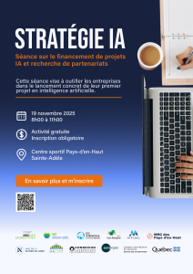 Cette séance vise à outiller les entreprises dans le lancement concret de leur premier projet en intelligence artificielle, en abordant les leviers de financement disponibles et les stratégies de maillage avec des partenaires techniques, institutionnels ou commerciaux. Organisée en collaboration avec Connexion Laurentides, cette activité permettra également de présenter le programme « Cap IA » et d’encourager la co-création de solutions concrètes sur le territoire.