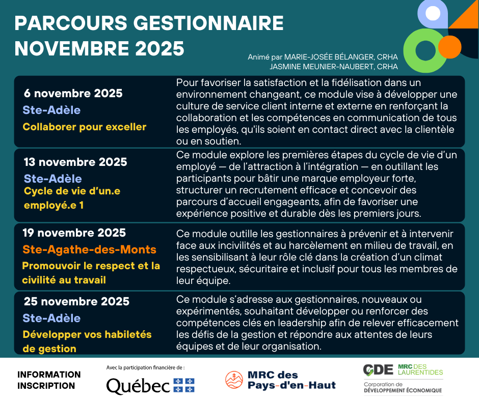 C’est avec enthousiasme que nous vous invitons à prendre part au Parcours Gestionnaire – Ateliers d’Octobre et Novembre 2025, une série d’ateliers pratiques et dynamiques conçus pour renforcer vos compétences en gestion, communication, leadership et développement organisationnel.