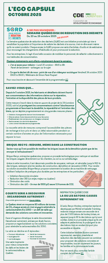 Notre conseillère en transition durable accompagne les entreprises du territoire dans leur évolution vers des modèles plus durables, en intégrant les enjeux environnementaux, sociaux et économiques à leurs activités tout en favorisant une transition collective, résiliente et porteuse de valeur pour l’ensemble du tissu économique local.
